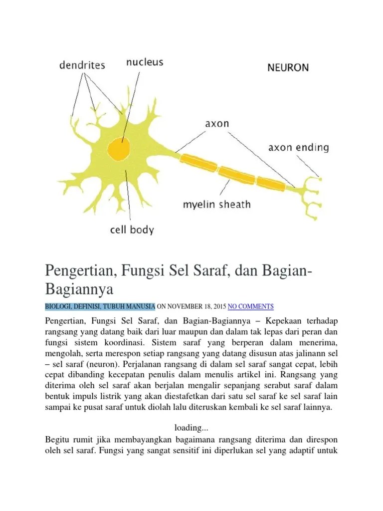 Komponen sistem saraf terdiri dari sel saraf (neuron), sistem saraf pusat, dan sistem saraf tepi. Neuron, yang juga dikenal sebagai sel saraf, bertugas untuk mengirim dan menerima. Anatomi dan bagian sistem saraf · 1. Sumsum tulang belakang · 3. Pada struktur sel seperti yang ditunjukkan ada gambar di atas memiliki . • semua akson dalam sistem saraf perifer . Sel saraf atau yang biasa disebut juga sebagai neuron adalah. Oleh karena itu, dalam membahasa tentang . Panjang dari dendrit , berfungsi menghantar impuls menjauhi badan sel ke neuron lain dan sel lain (sel otot, kelenjar). Neuron terdiri dari beberapa bagian, yaitu: .
